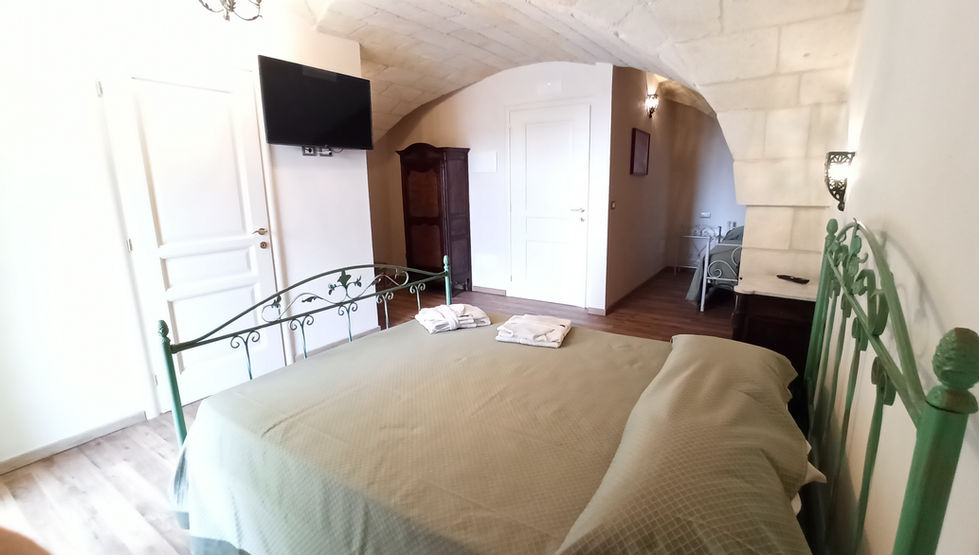 La camera riprende lo stile tipico delle vecchie masserie del Salento: sovrastata da volte a stella, è dotata di bagno privato interno con doccia e arredata con un letto intarsiato in ferro e materassi costruiti su misura, per offrirti un soggiorno all’insegna del comfort e del relax. Camera a primo piano con accesso indipendente.
